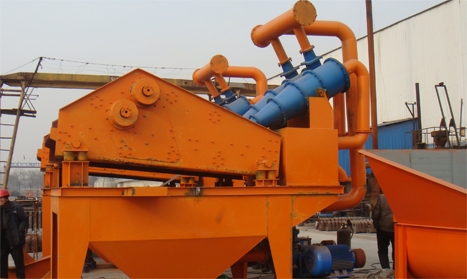 將砂水混合物輸送至旋流器,離心分級濃縮的細紗經沉砂嘴提供給振動篩,經振動篩脫水后,細砂與水有效分離,少量細紗、泥等經返料箱再回到清洗槽,清洗槽液面過高時,經出料口排出。直線振動篩回收物料重量濃度為70%-85%。調節細度模數可通過改變泵轉速、改變砂漿濃度、調節溢流水量、更換出砂嘴來實現。從而完成清洗、脫水和分級三種功能。